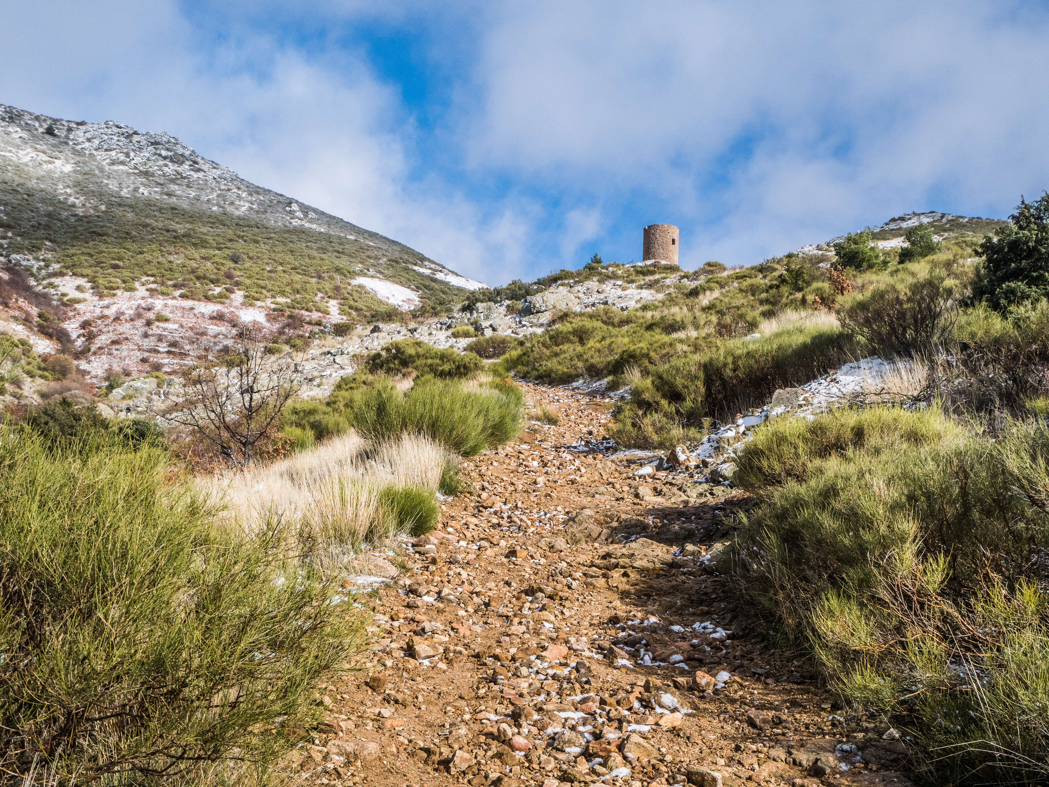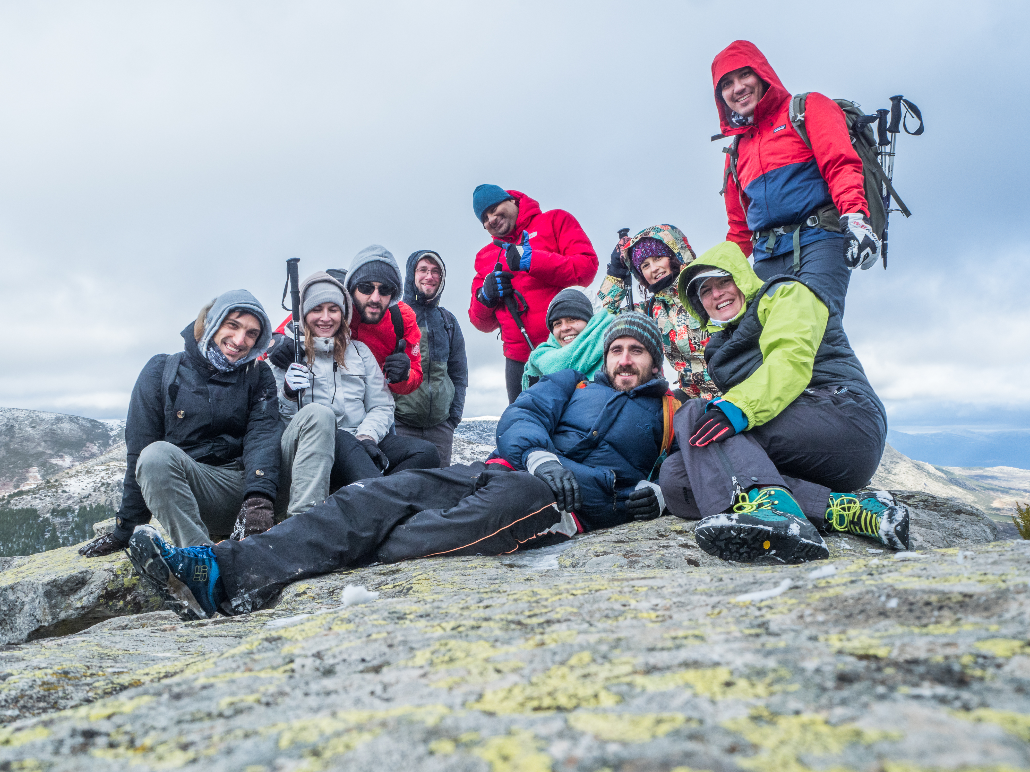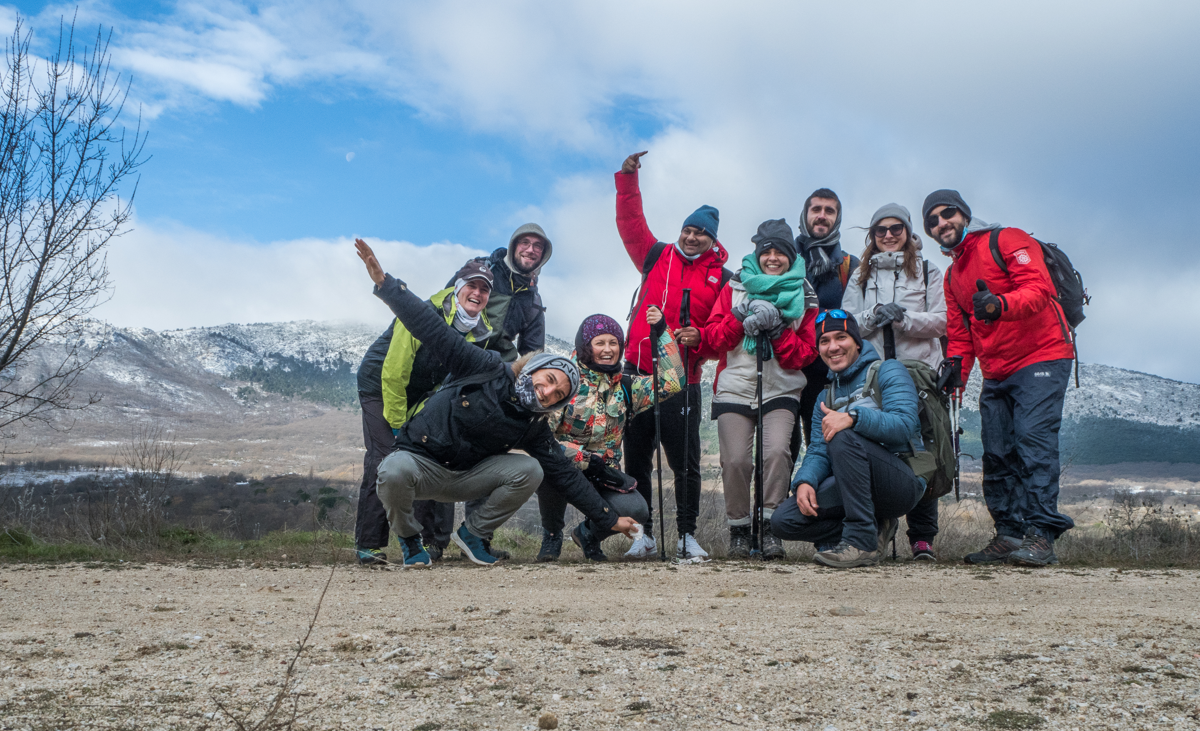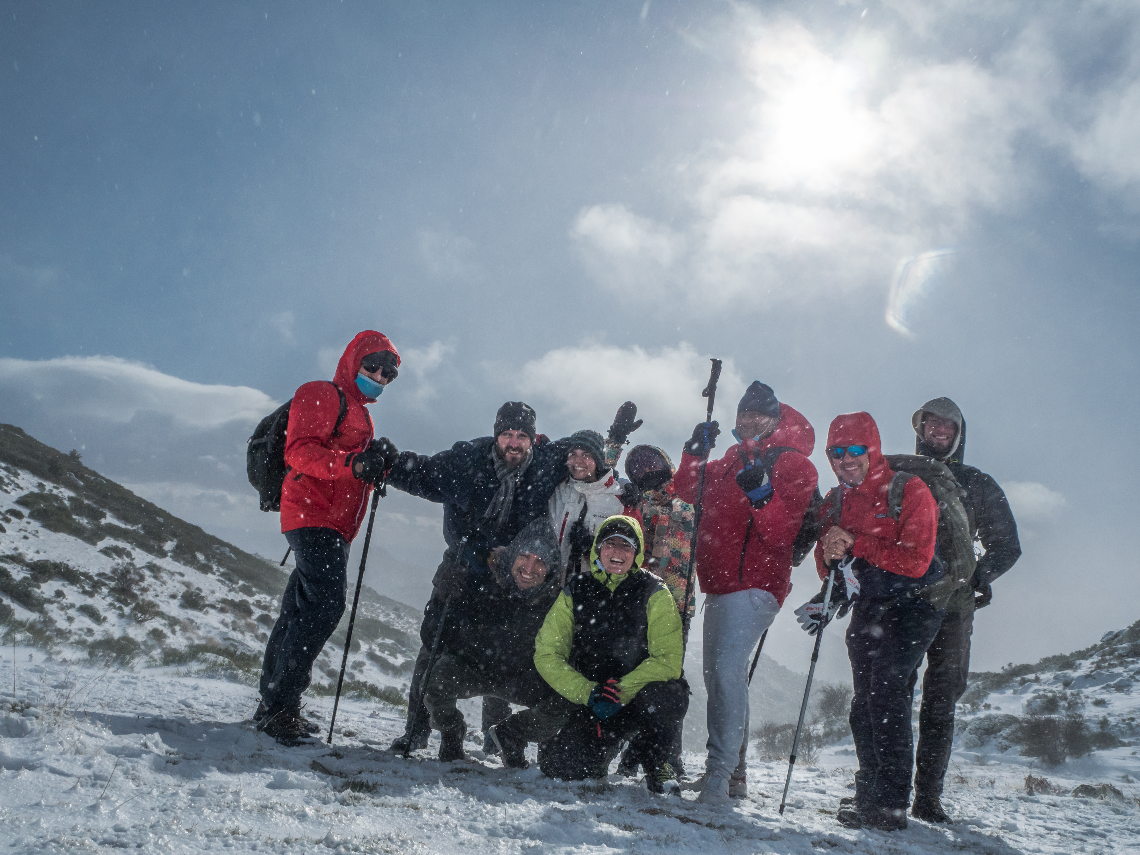 Description: Follow the dirt trail from the parking lot by the football pitch, by the time you walk around the foot of the mountain, you will see the tower of the silver mine in front / slightly above you. You will reach it in less than half an hour. Keep climbing along a little stream in the channel between the peaks until you reach the meadow of Collado Abierto. I suppose on a normal day, the path is clearly visible. On the day of our hike it took some guesswork, as the snowline started just above the tower, so we were walking in the stream rather than along it. We started the hike with a beautiful mild autumn day, but up in the open we walked into a snowstorm and strong freezing winds, which accompanied us all the way to the peak (seemed longer than it was, I estimate the climb from Collado Abierto to Cabeza de la Braña didn’t take more than 30 minutes). At the top we took refuge in the forest and waited for the whole group to arrive, had some cookies and tea and a little rest (it realty was cold). To descend, just follow the treeline on your right hand side, and you can either walk through the forest or on the ridge, it doesn’t really matter, both options will lead to the esplanade of Navasaces, almost to Puerto de Canencia, where you will once again see the valley of Vallehermoso in front of you and the trail will take you back to the football pitch. Wikiloc for your convenience here.
