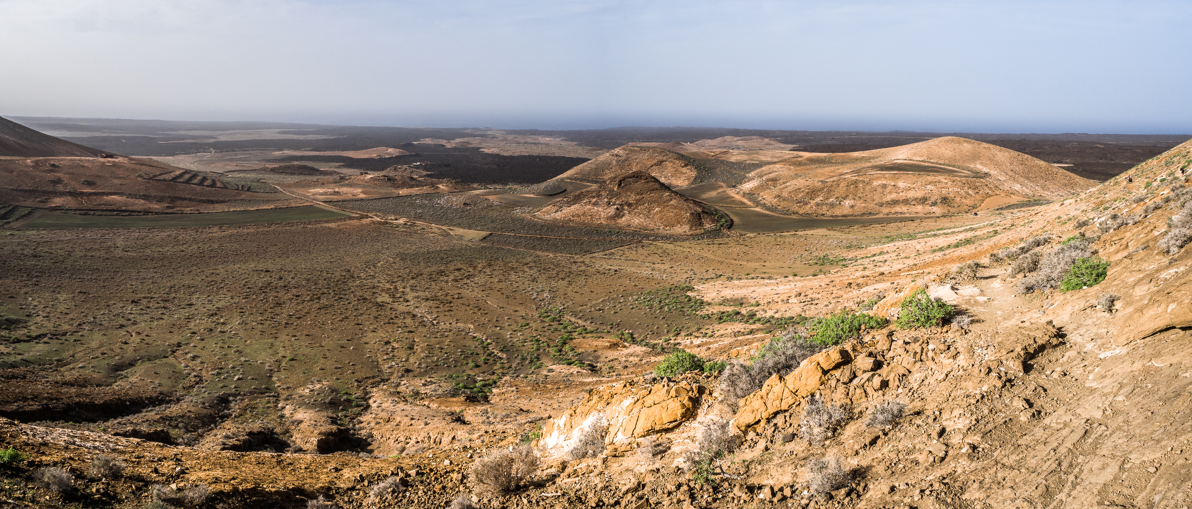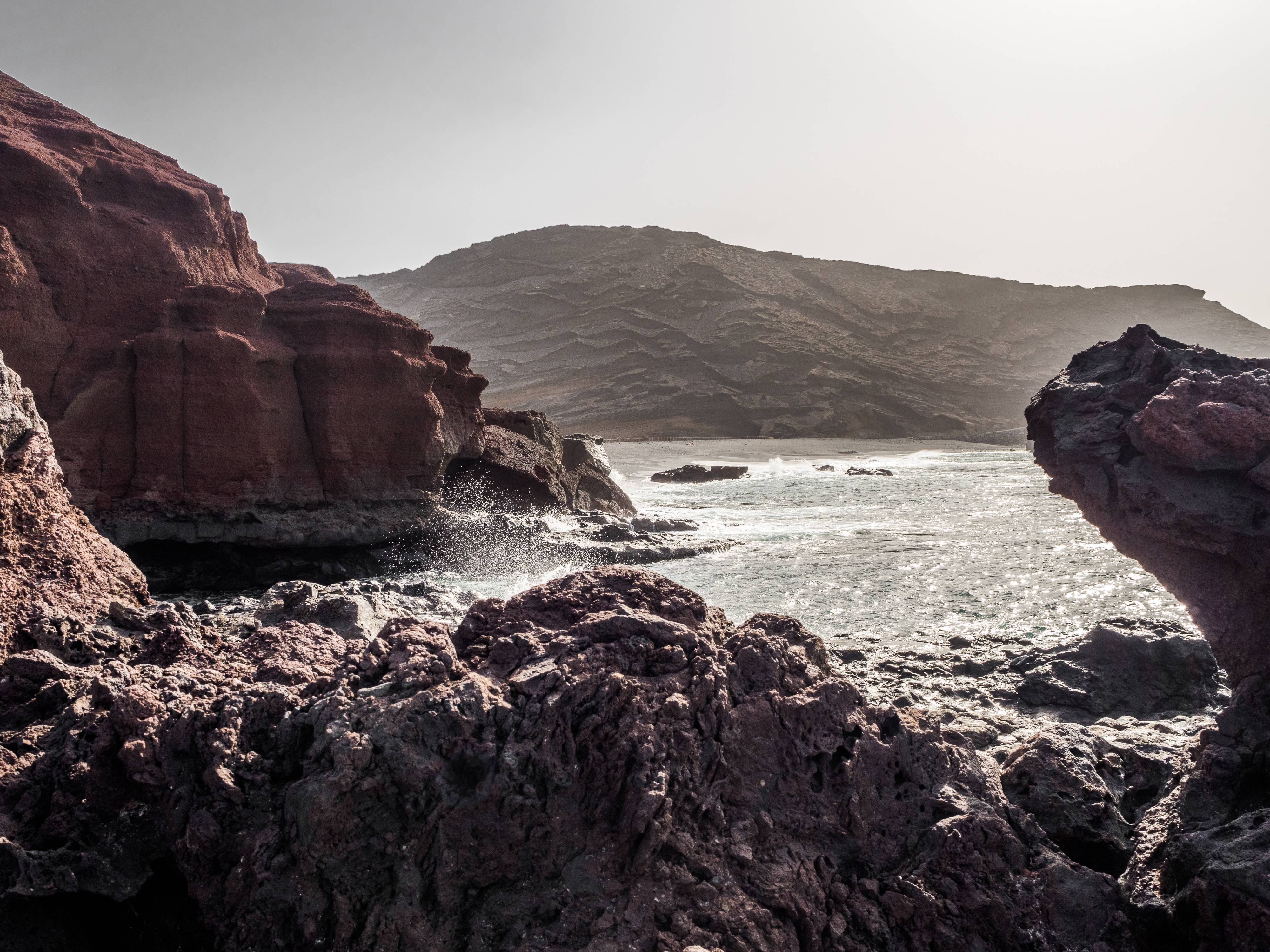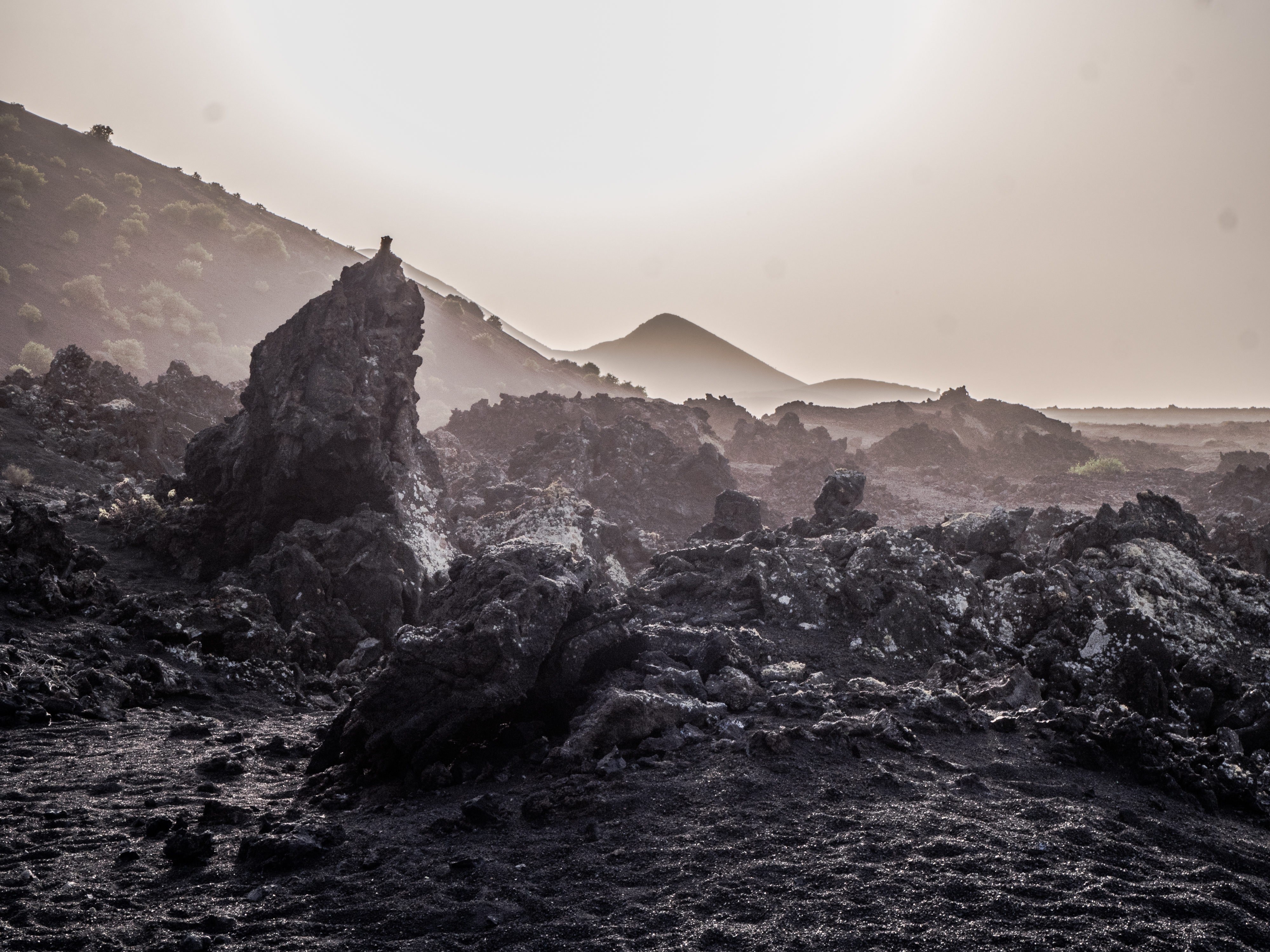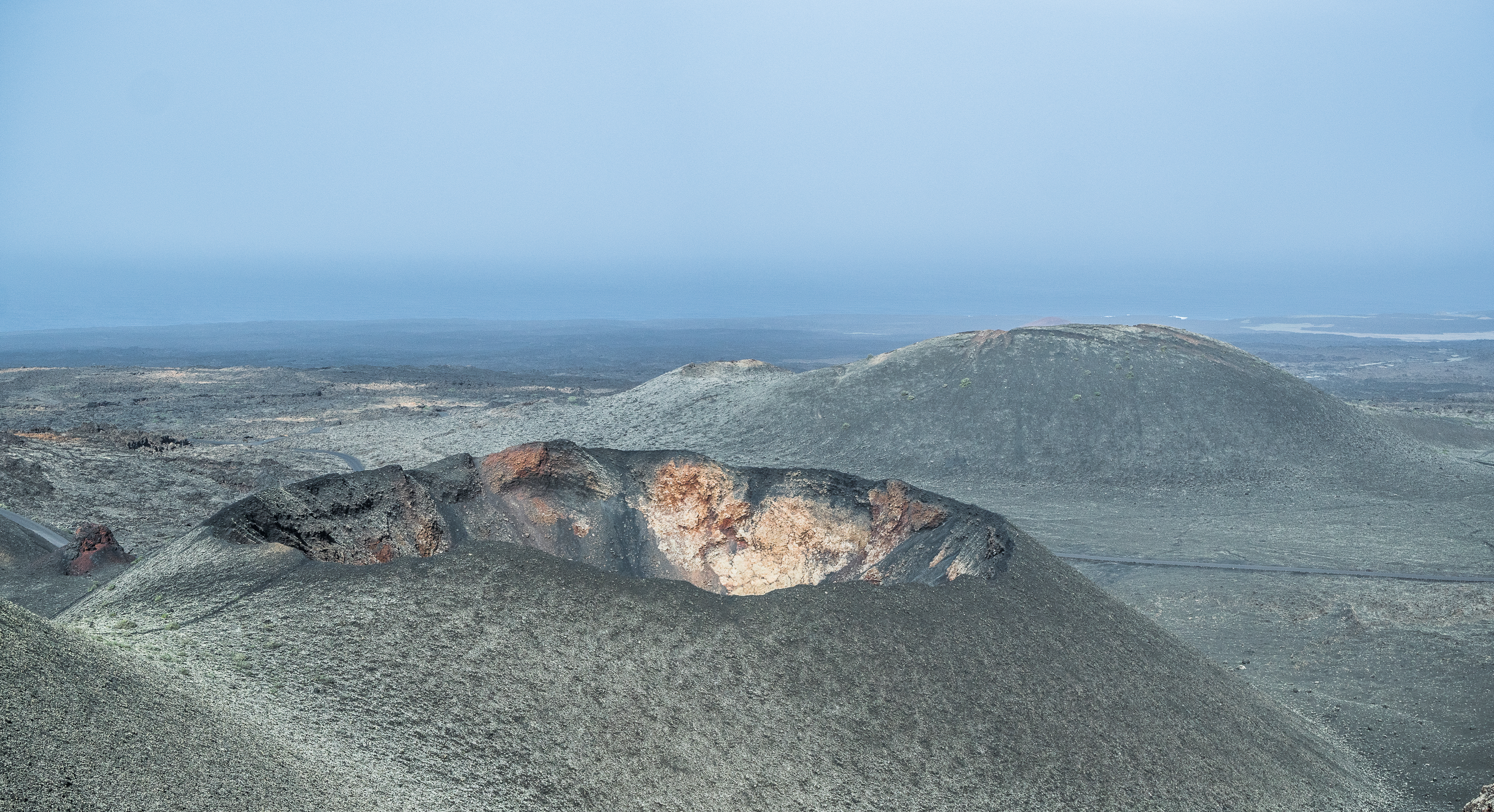 However, admiring nature from a bus is not my strongest quality (although I do acknowledge that people are generally idiots, so not letting them wander around lava fields is for their own good, and possibly saves some money to the local rescue services, too), so if you fancy stretching your legs, hike the Caldera Blanca loop, just 10 minutes drive away on LZ-67 towards Mancha Blanca. There is a sign that marks the dirt road that will take you towards the starting point of the trek, and quite spacious (free) parking. I say spacious, because the island was basically empty due to worldwide travel restrictions, I imagine parking anywhere in the high season may be quite stressful, but then I’d struggle to park a Fiat 500 on an empty airport, so don’t take my word for it. The trail is pretty straightforward – mainly because everywhere else is covered with massive chunks of cooled lava, which makes inadvertently straying off the path impossible. It’s a fairly easy but tremendously rewarding hike. The overall climb is just over 400 m, half of which you’ll be walking on the edge of the crater. The view is extraordinary: the immense crater at your feet, the ocean in the distance, lava fields, Timanfaya and the Fire Mountains around you. Calima (the African wind charged with desert sand) was blowing for the entire time of my visit, hence the reddish haze in most of the photographs. Wikiloc for your convenience here.