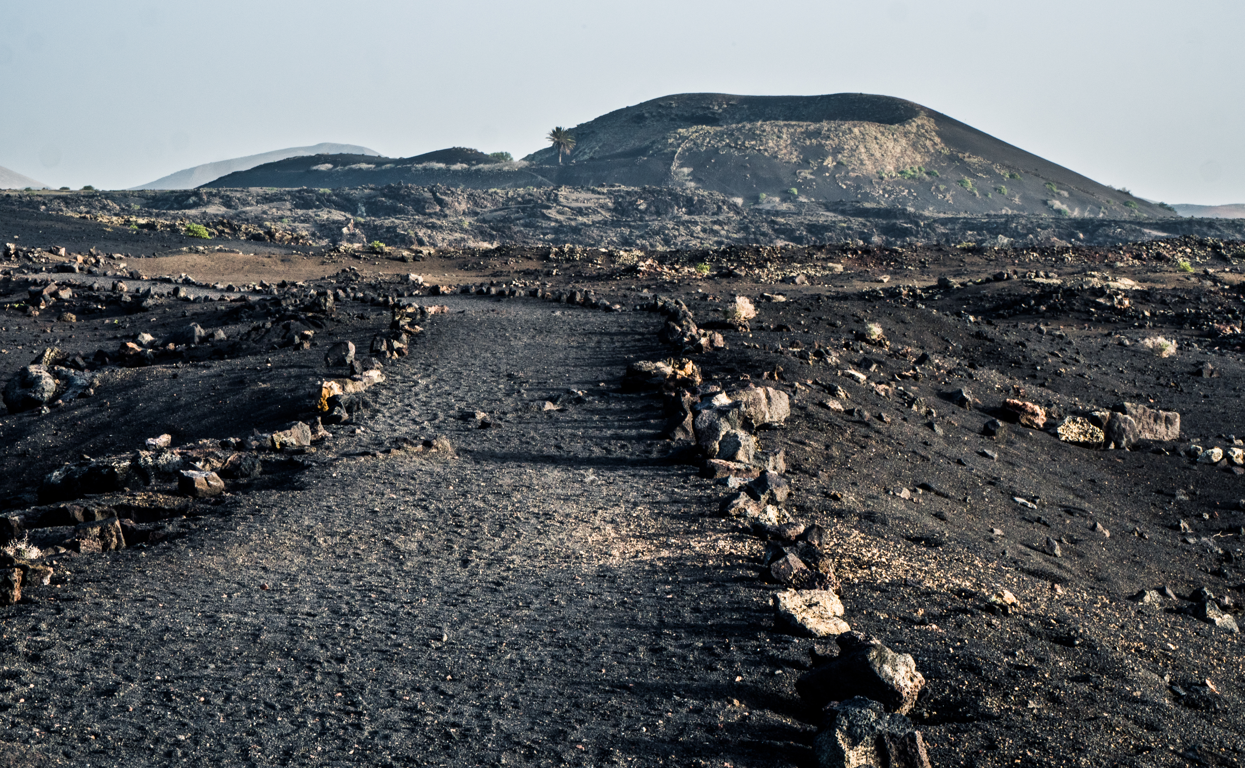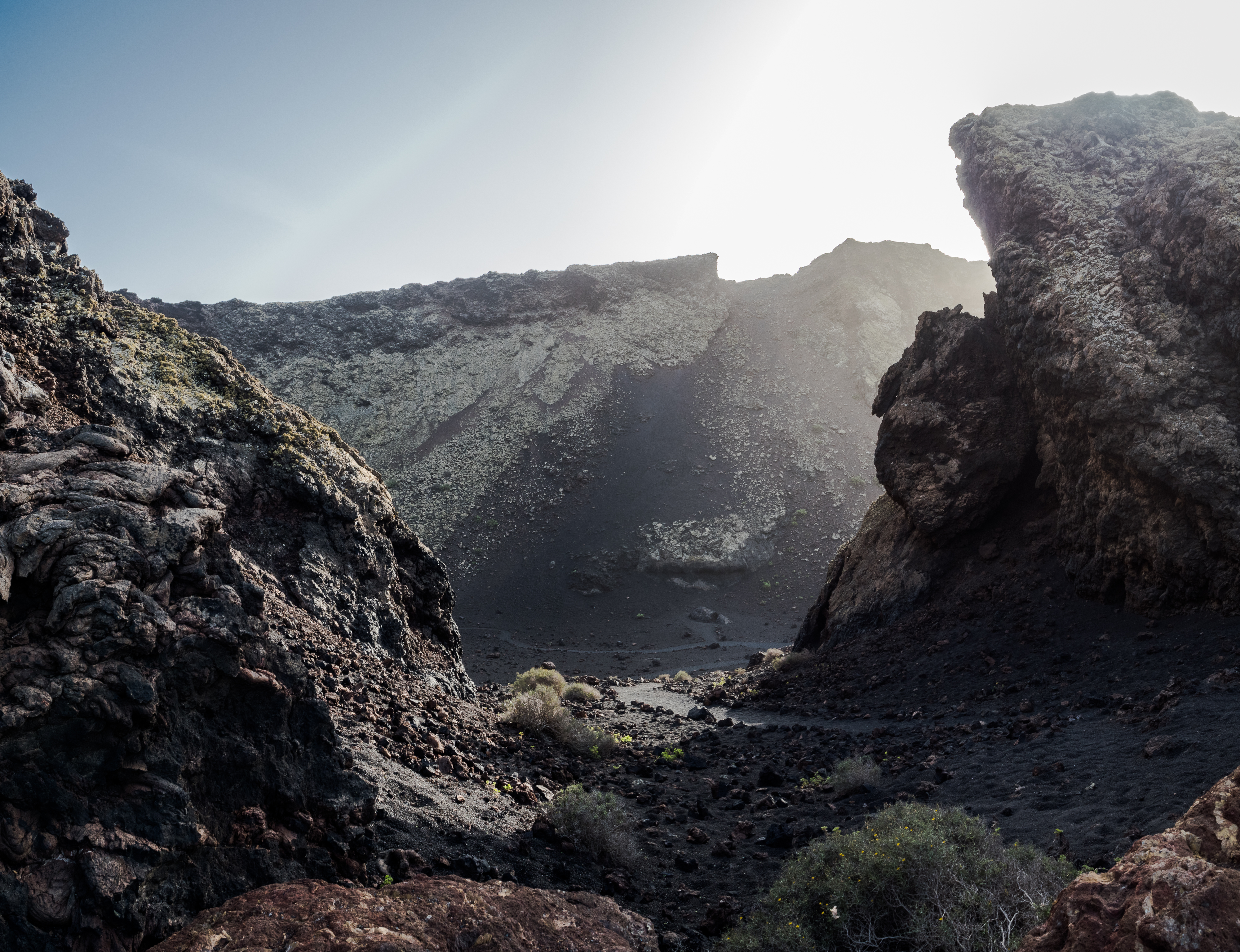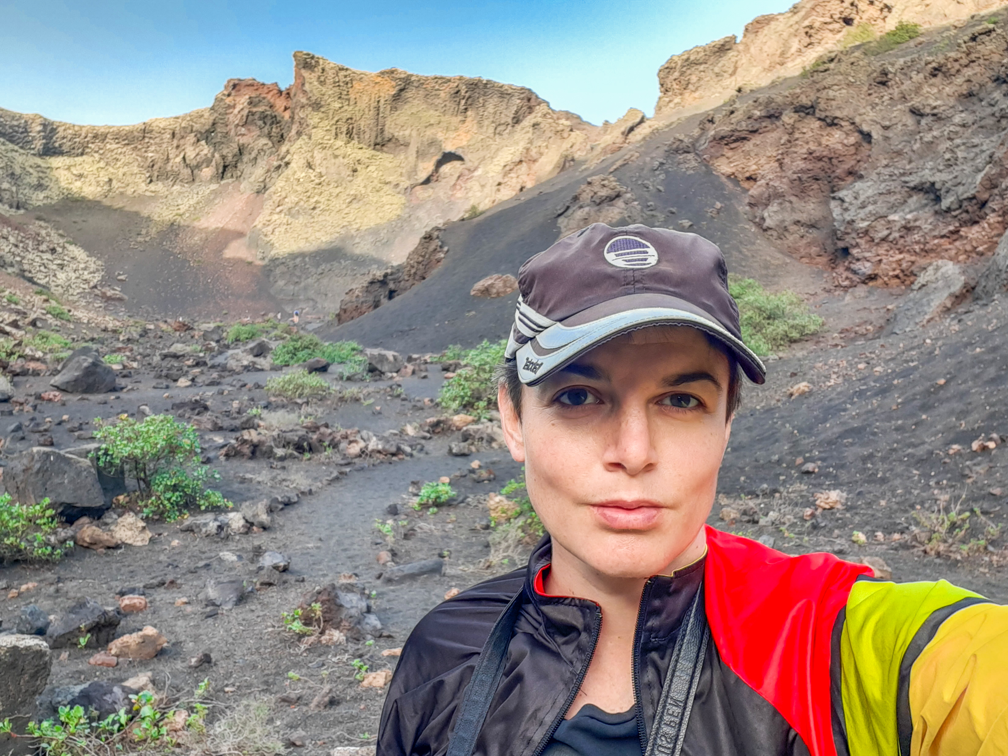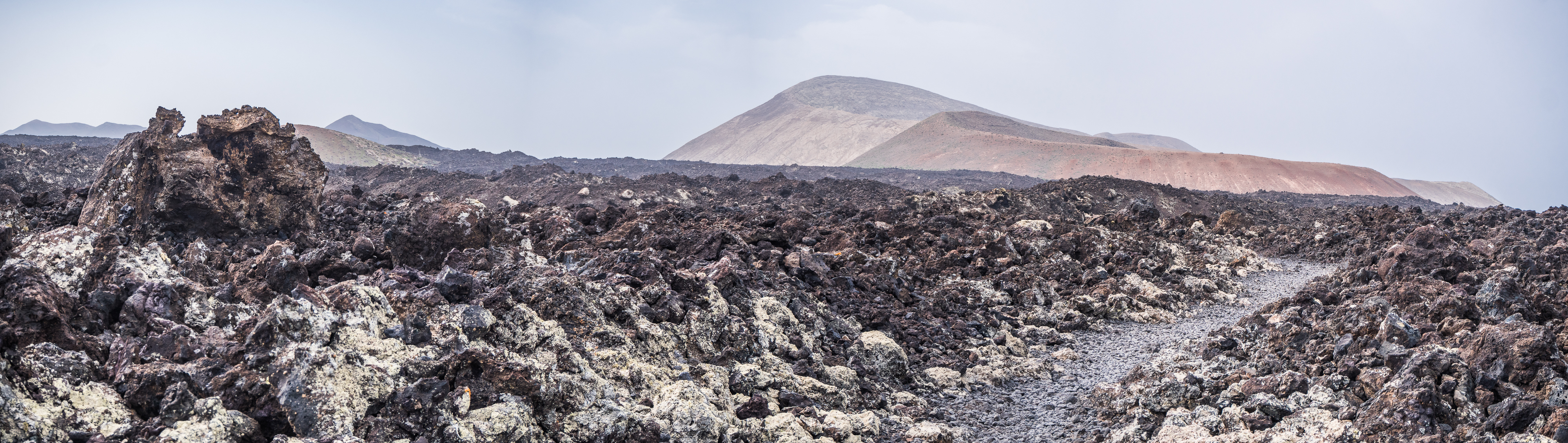 However, admiring nature from a bus is not my strongest quality (although I do acknowledge that people are generally idiots, so not letting them wander around lava fields is for their own good, and possibly saves some money to the local rescue services, too), so if you fancy stretching your legs, hike the Caldera Blanca loop, just 10 minutes drive away on LZ-67 towards Mancha Blanca. There is a sign that marks the dirt road that will take you towards the starting point of the trek, and quite spacious (free) parking. I say spacious, because the island was basically empty due to worldwide travel restrictions, I imagine parking anywhere in the high season may be quite stressful, but then I’d struggle to park a Fiat 500 on an empty airport, so don’t take my word for it. The trail is pretty straightforward – mainly because everywhere else is covered with massive chunks of cooled lava, which makes inadvertently straying off the path impossible. It’s a fairly easy but tremendously rewarding hike. The overall climb is just over 400 m, half of which you’ll be walking on the edge of the crater. The view is extraordinary: the immense crater at your feet, the ocean in the distance, lava fields, Timanfaya and the Fire Mountains around you. Calima (the African wind charged with desert sand) was blowing for the entire time of my visit, hence the reddish haze in most of the photographs. Wikiloc for your convenience here.