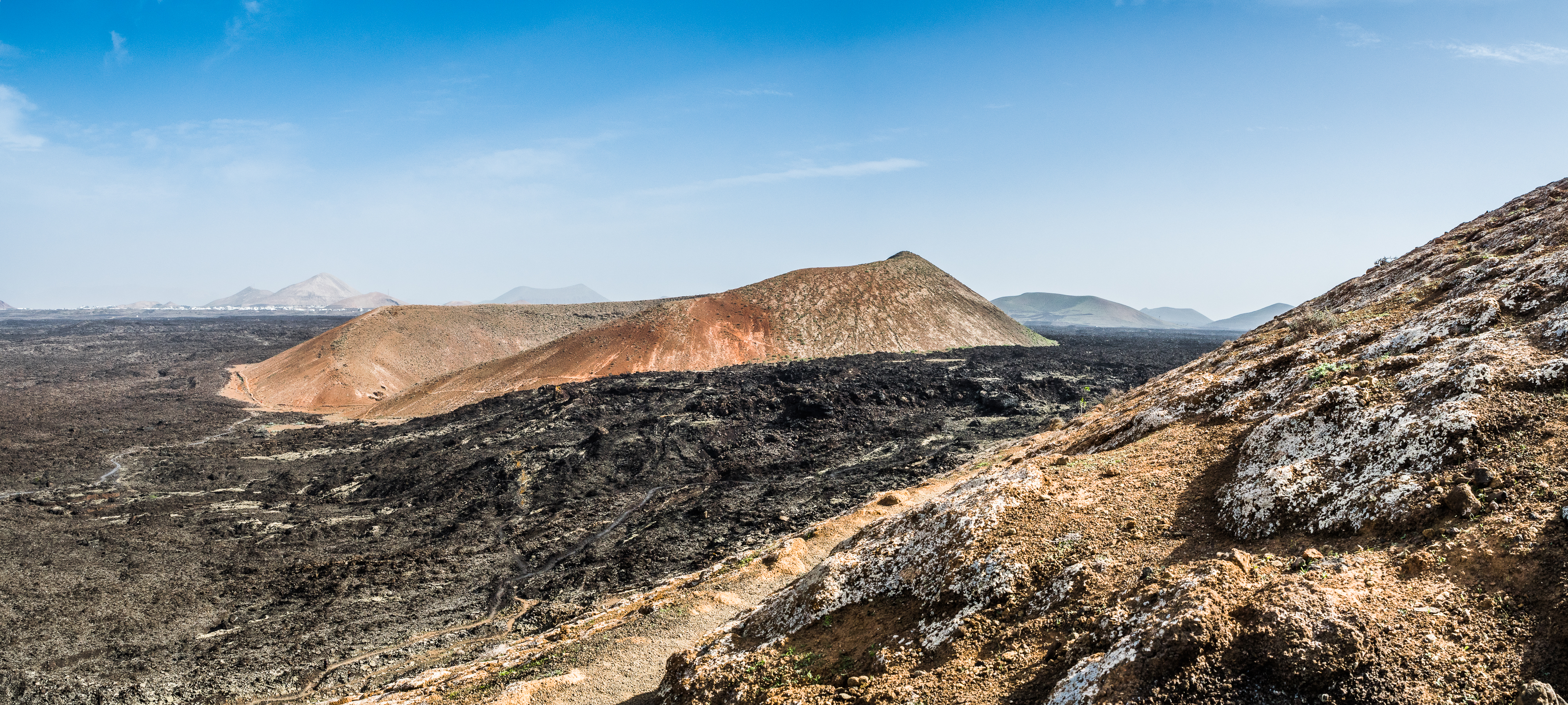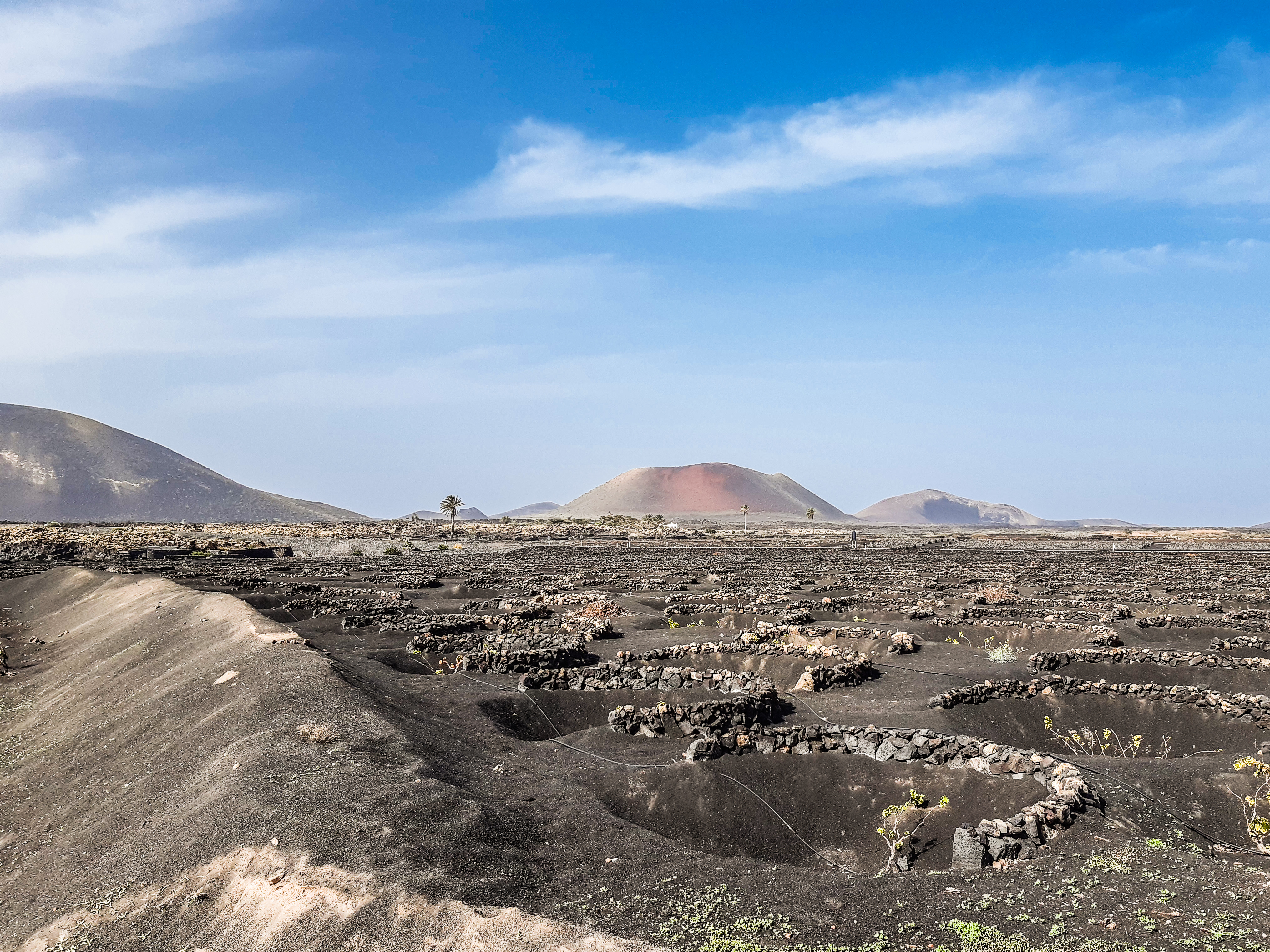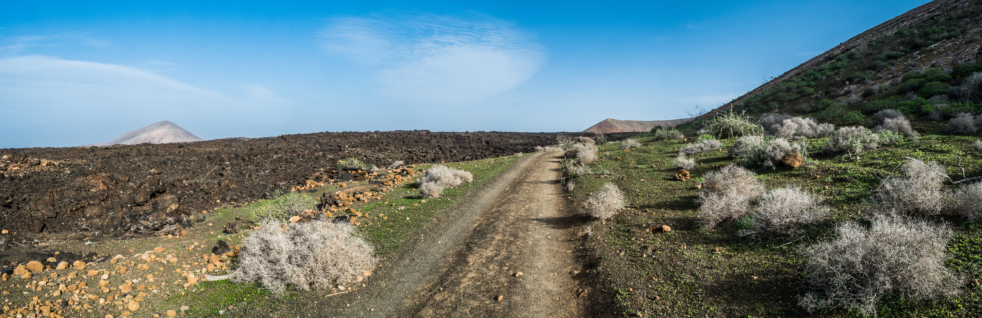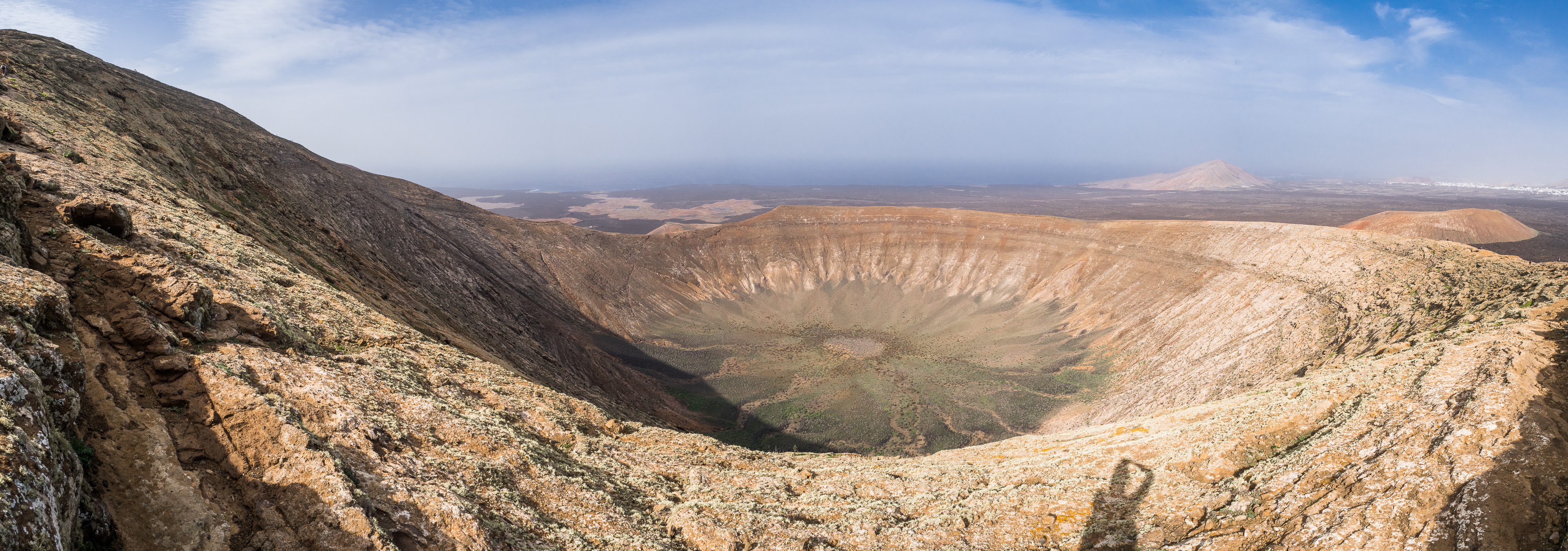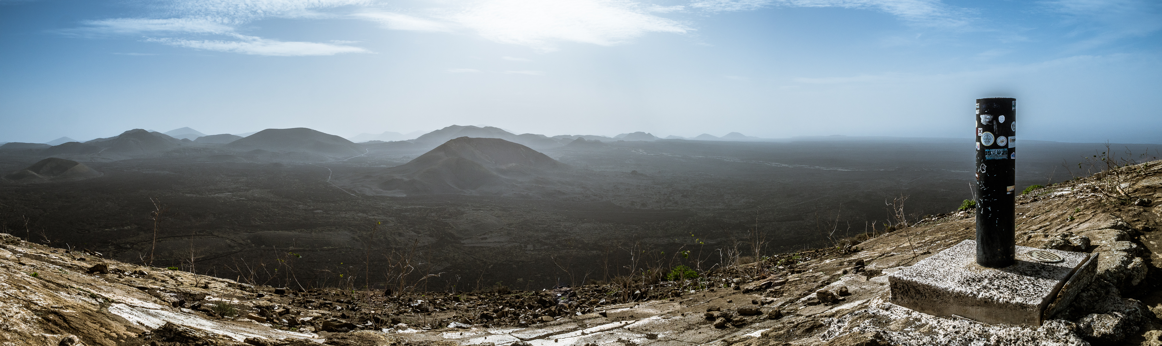 However, admiring nature from a bus is not my strongest quality (although I do acknowledge that people are generally idiots, so not letting them wander around lava fields is for their own good, and possibly saves some money to the local rescue services, too), so if you fancy stretching your legs, hike the Caldera Blanca loop, just 10 minutes drive away on LZ-67 towards Mancha Blanca. There is a sign that marks the dirt road that will take you towards the starting point of the trek, and quite spacious (free) parking. I say spacious, because the island was basically empty due to worldwide travel restrictions, I imagine parking anywhere in the high season may be quite stressful, but then I’d struggle to park a Fiat 500 on an empty airport, so don’t take my word for it. The trail is pretty straightforward – mainly because everywhere else is covered with massive chunks of cooled lava, which makes inadvertently straying off the path impossible. It’s a fairly easy but tremendously rewarding hike. The overall climb is just over 400 m, half of which you’ll be walking on the edge of the crater. The view is extraordinary: the immense crater at your feet, the ocean in the distance, lava fields, Timanfaya and the Fire Mountains around you. Calima (the African wind charged with desert sand) was blowing for the entire time of my visit, hence the reddish haze in most of the photographs. Wikiloc for your convenience here.