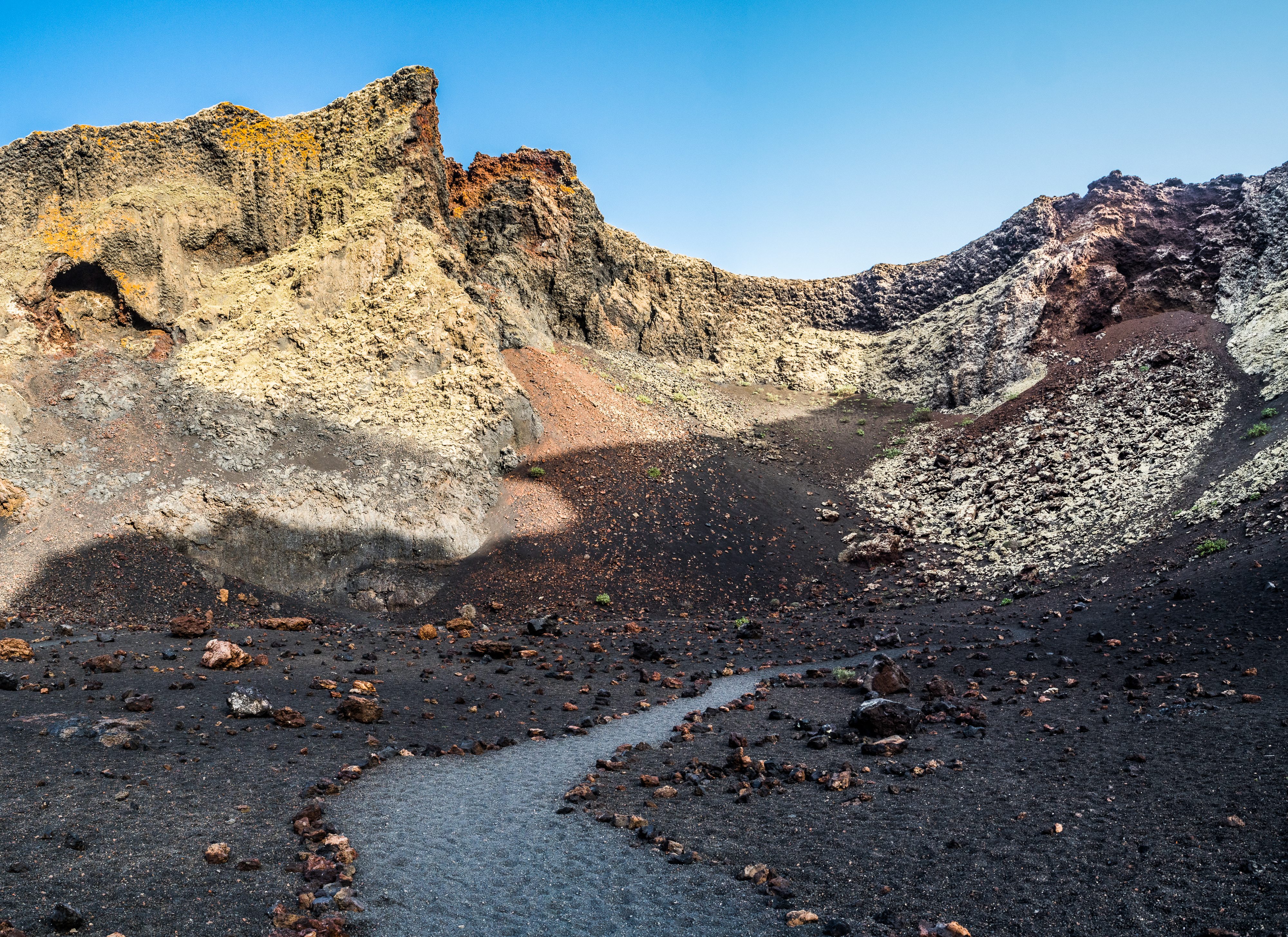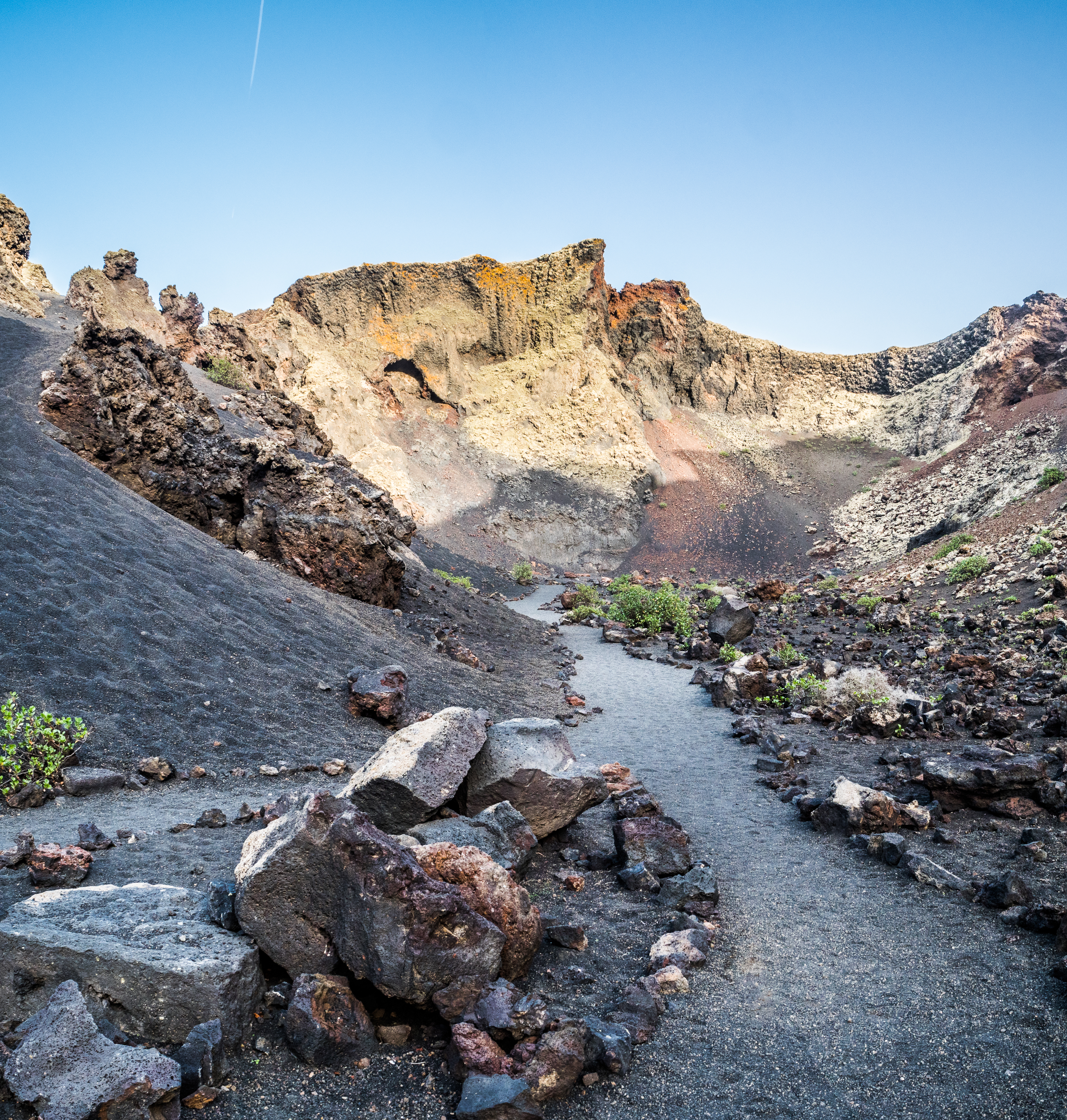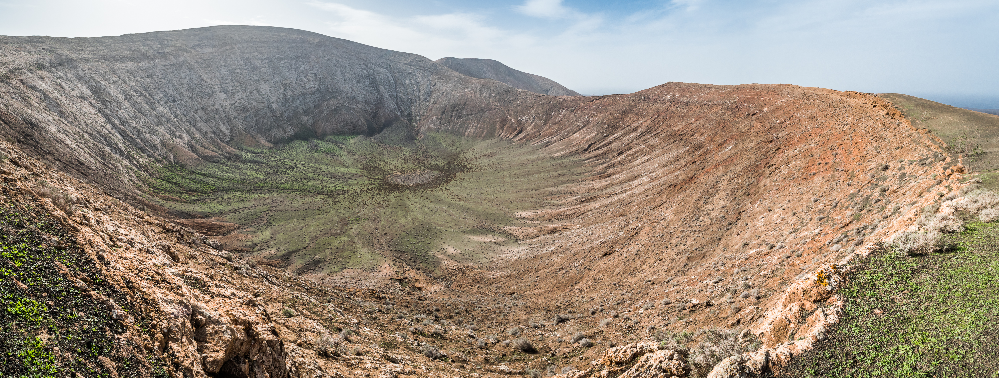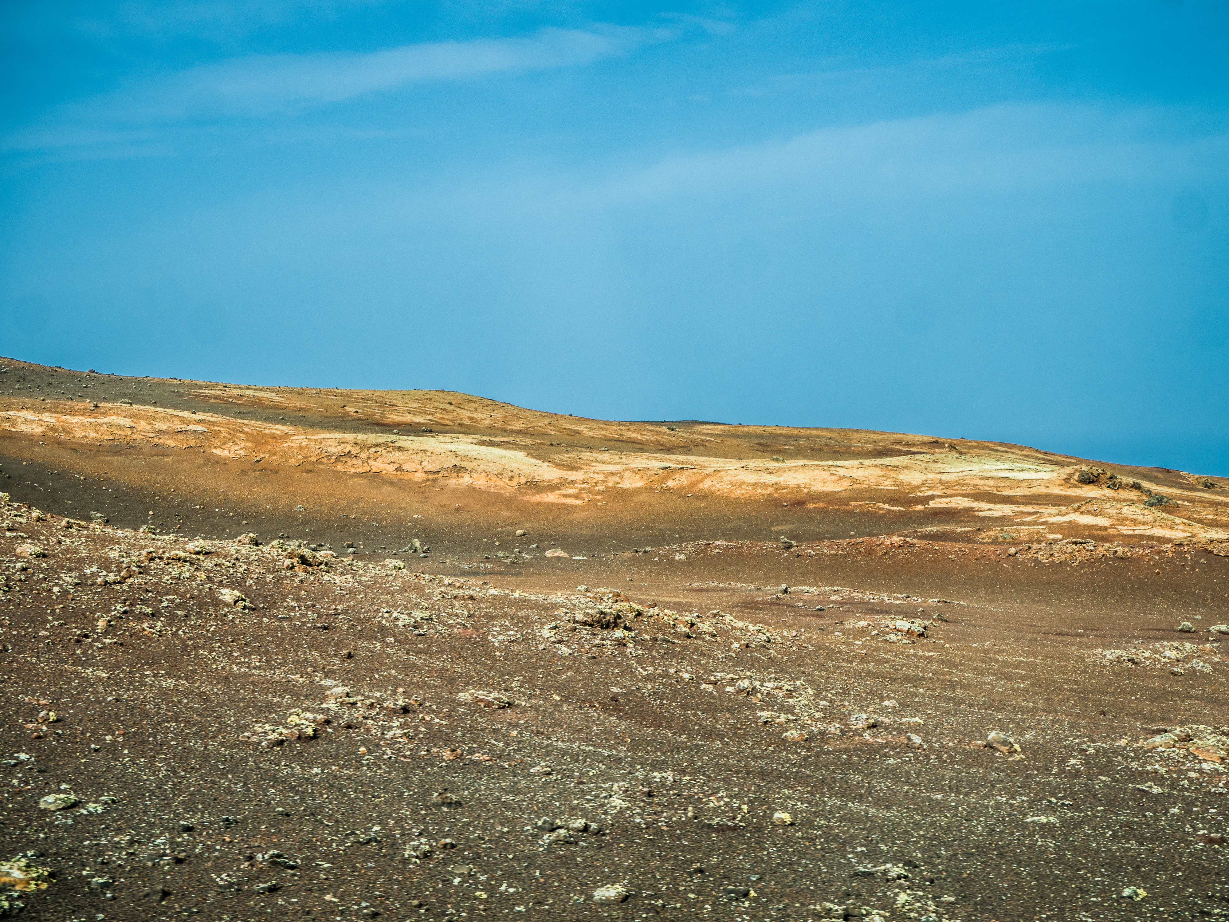 However, admiring nature from a bus is not my strongest quality (although I do acknowledge that people are generally idiots, so not letting them wander around lava fields is for their own good, and possibly saves some money to the local rescue services, too), so if you fancy stretching your legs, hike the Caldera Blanca loop, just 10 minutes drive away on LZ-67 towards Mancha Blanca. There is a sign that marks the dirt road that will take you towards the starting point of the trek, and quite spacious (free) parking. I say spacious, because the island was basically empty due to worldwide travel restrictions, I imagine parking anywhere in the high season may be quite stressful, but then I’d struggle to park a Fiat 500 on an empty airport, so don’t take my word for it. The trail is pretty straightforward – mainly because everywhere else is covered with massive chunks of cooled lava, which makes inadvertently straying off the path impossible. It’s a fairly easy but tremendously rewarding hike. The overall climb is just over 400 m, half of which you’ll be walking on the edge of the crater. The view is extraordinary: the immense crater at your feet, the ocean in the distance, lava fields, Timanfaya and the Fire Mountains around you. Calima (the African wind charged with desert sand) was blowing for the entire time of my visit, hence the reddish haze in most of the photographs. Wikiloc for your convenience here.