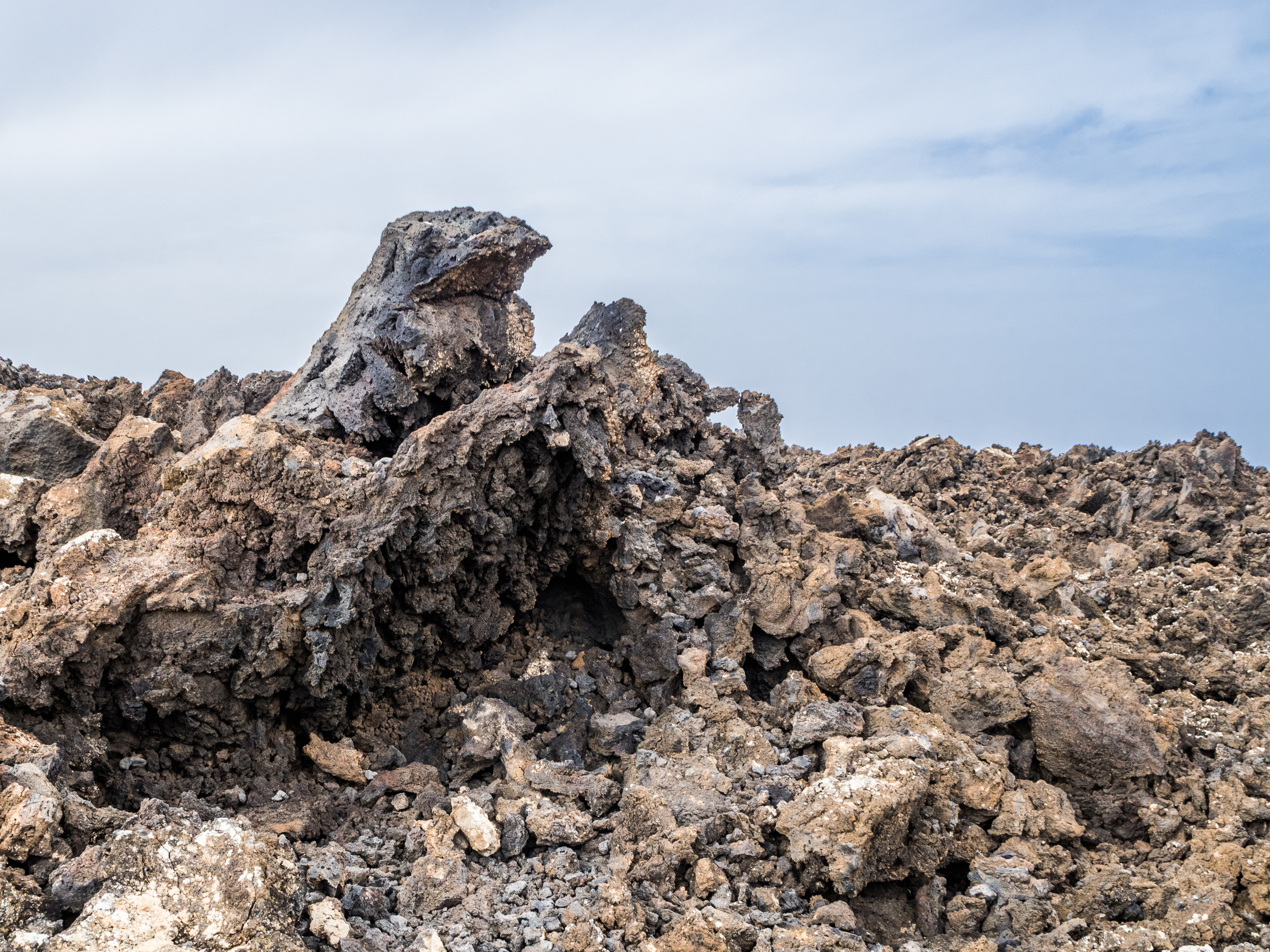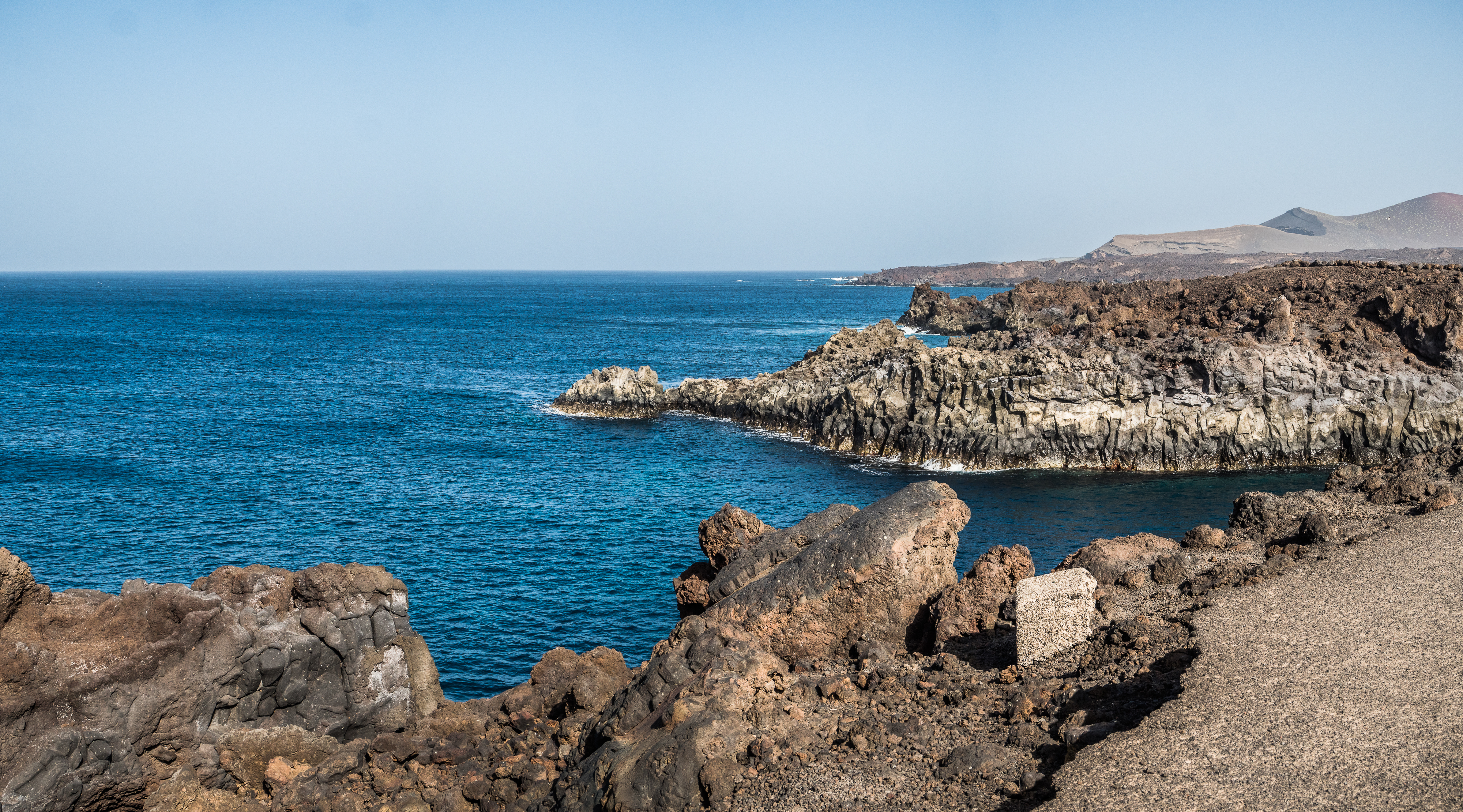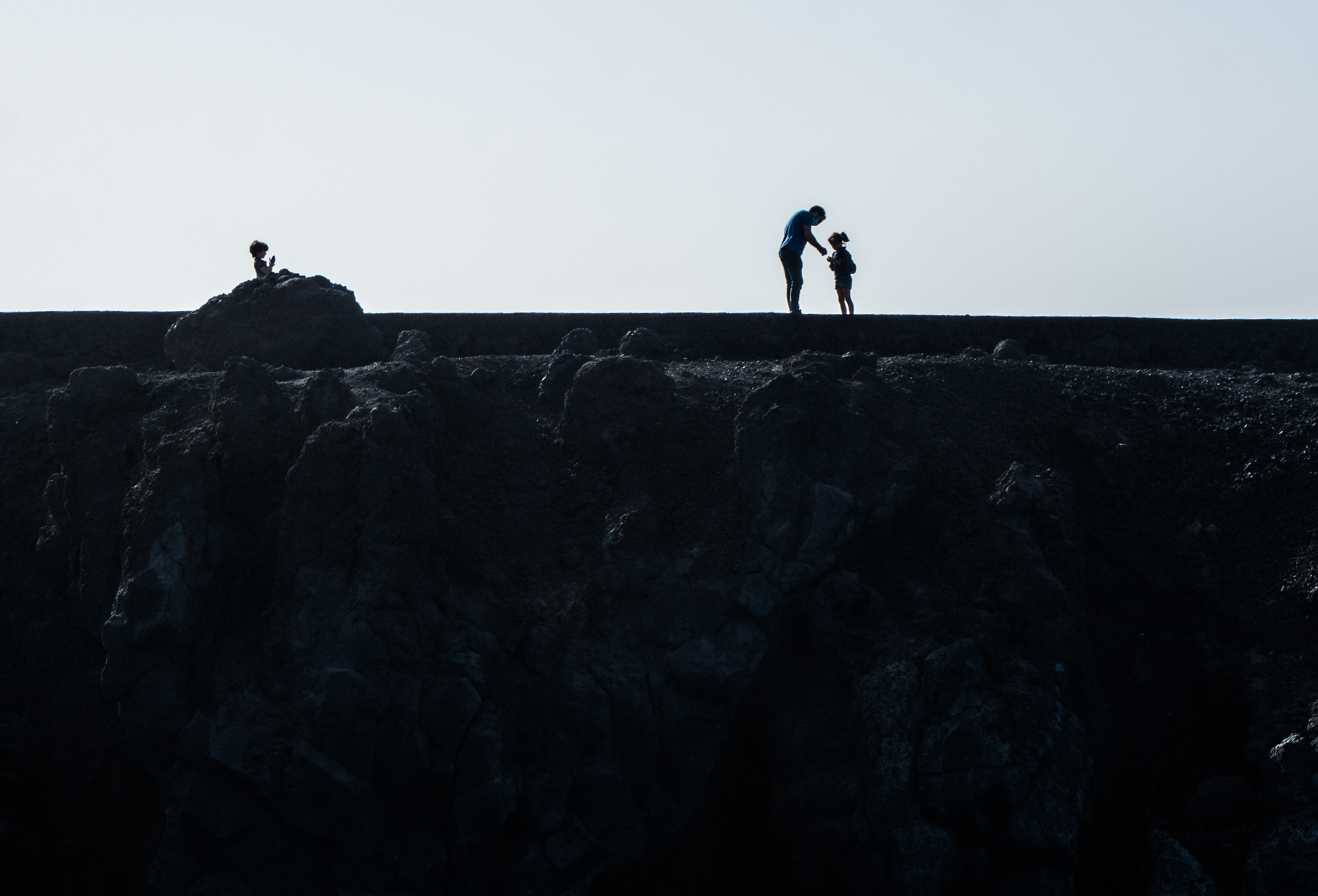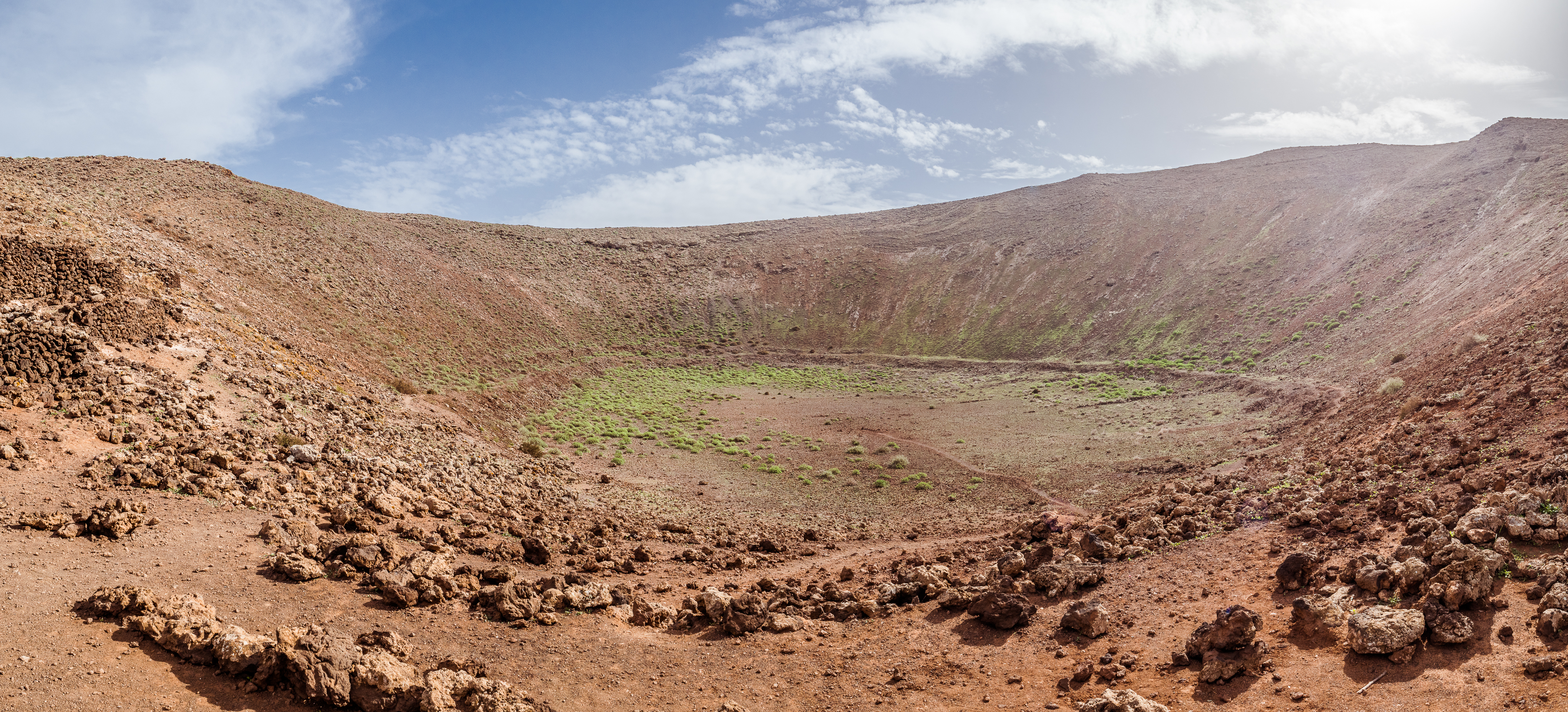 However, admiring nature from a bus is not my strongest quality (although I do acknowledge that people are generally idiots, so not letting them wander around lava fields is for their own good, and possibly saves some money to the local rescue services, too), so if you fancy stretching your legs, hike the Caldera Blanca loop, just 10 minutes drive away on LZ-67 towards Mancha Blanca. There is a sign that marks the dirt road that will take you towards the starting point of the trek, and quite spacious (free) parking. I say spacious, because the island was basically empty due to worldwide travel restrictions, I imagine parking anywhere in the high season may be quite stressful, but then I’d struggle to park a Fiat 500 on an empty airport, so don’t take my word for it. The trail is pretty straightforward – mainly because everywhere else is covered with massive chunks of cooled lava, which makes inadvertently straying off the path impossible. It’s a fairly easy but tremendously rewarding hike. The overall climb is just over 400 m, half of which you’ll be walking on the edge of the crater. The view is extraordinary: the immense crater at your feet, the ocean in the distance, lava fields, Timanfaya and the Fire Mountains around you. Calima (the African wind charged with desert sand) was blowing for the entire time of my visit, hence the reddish haze in most of the photographs. Wikiloc for your convenience here.