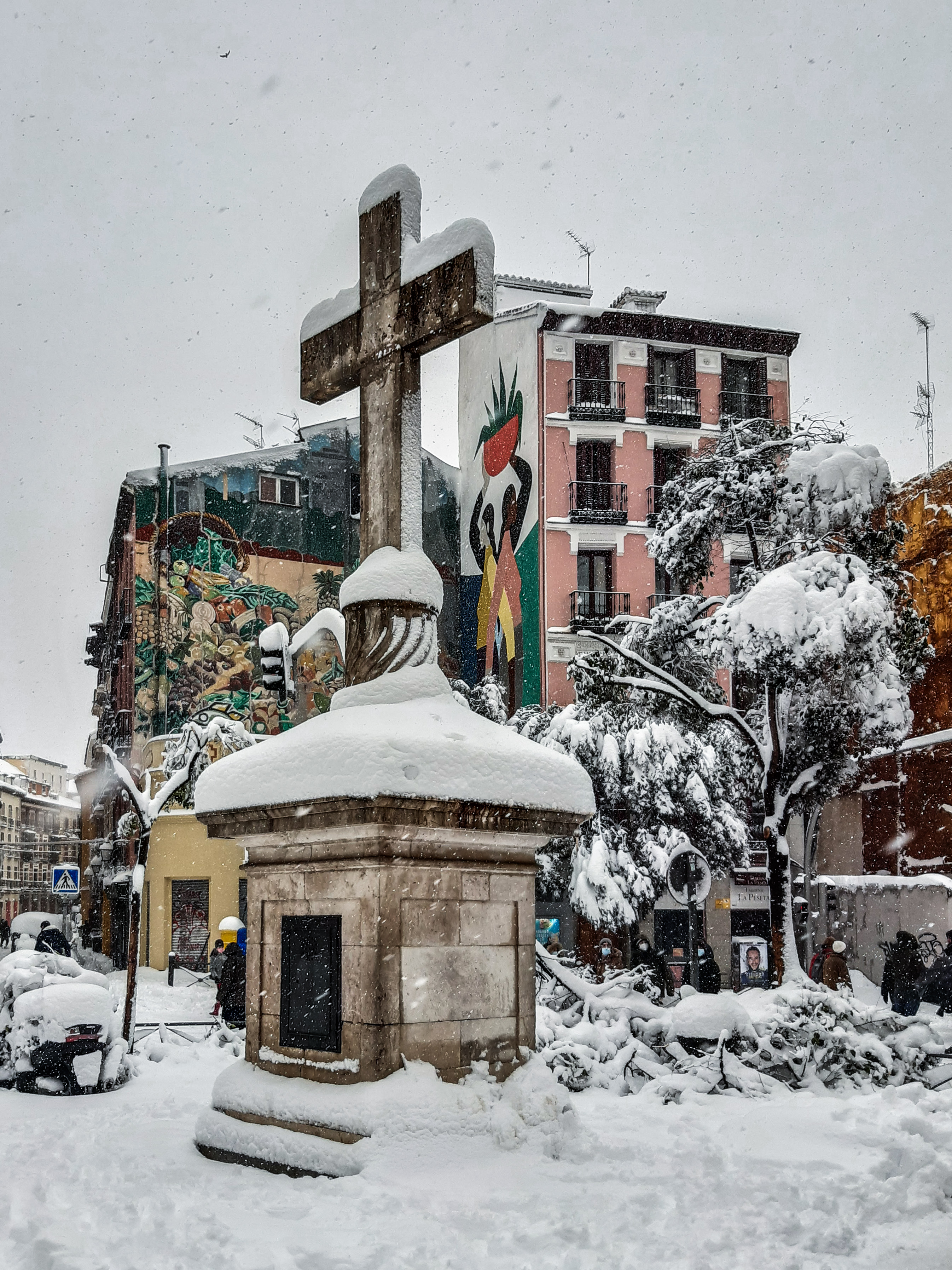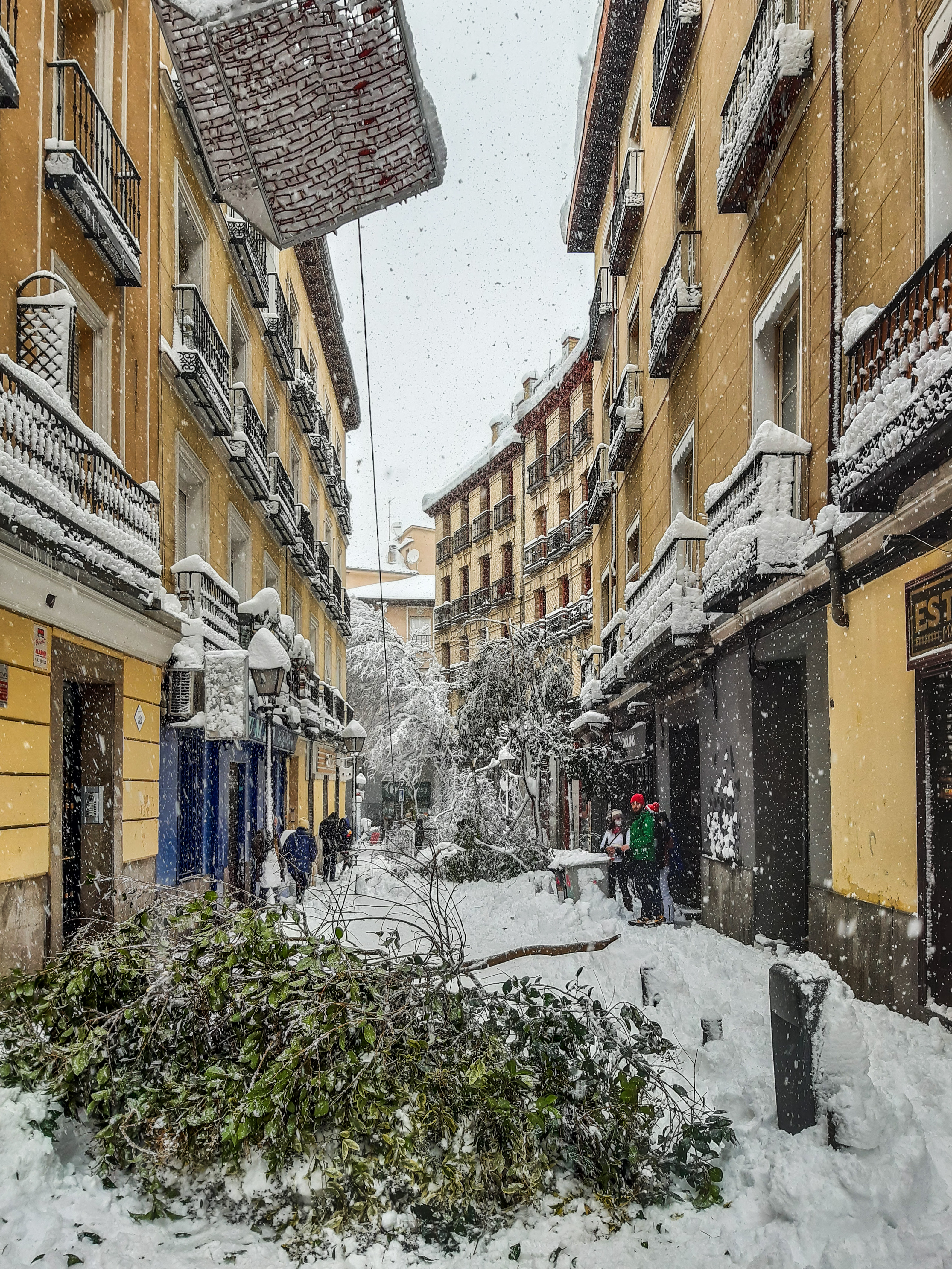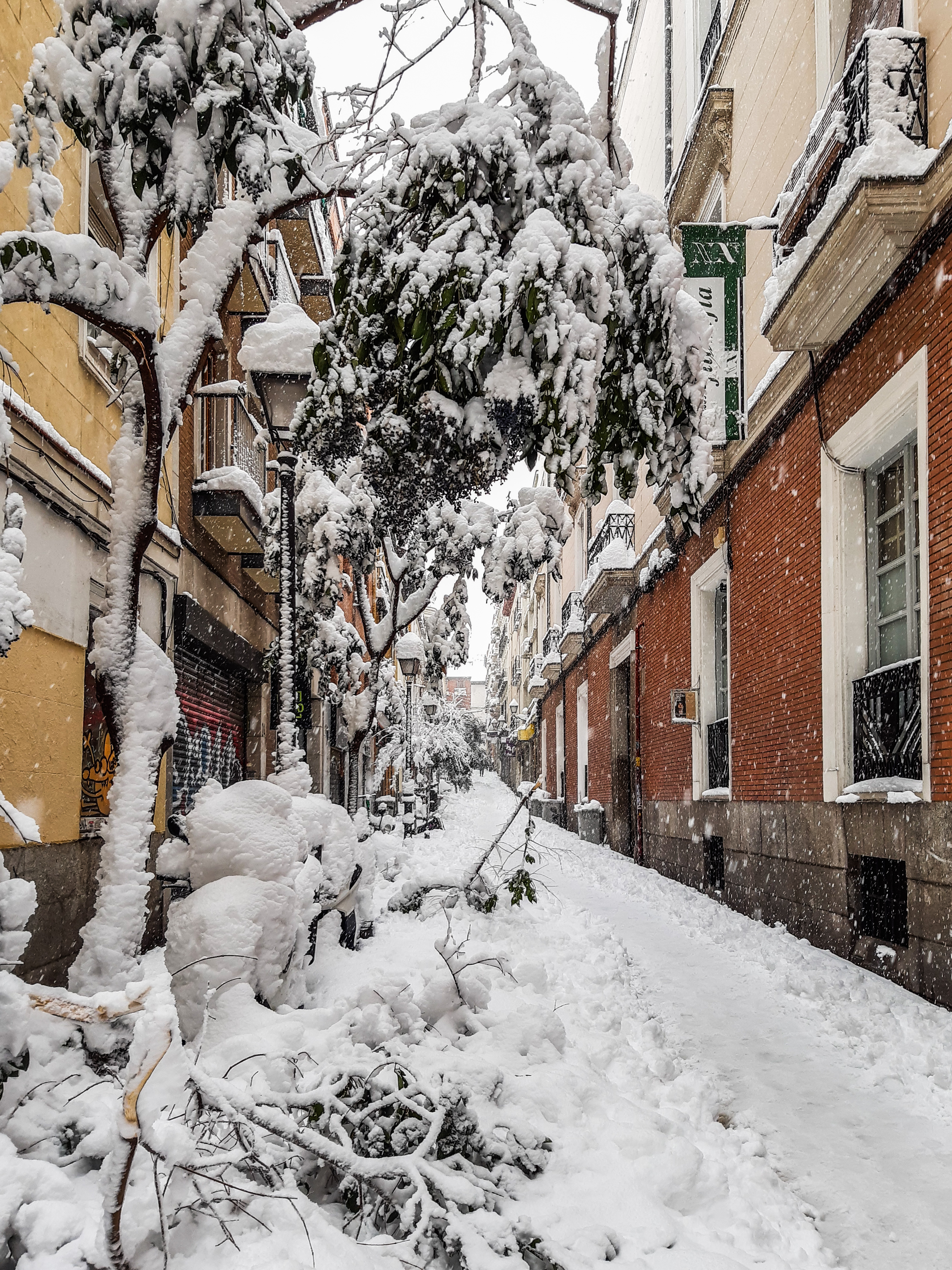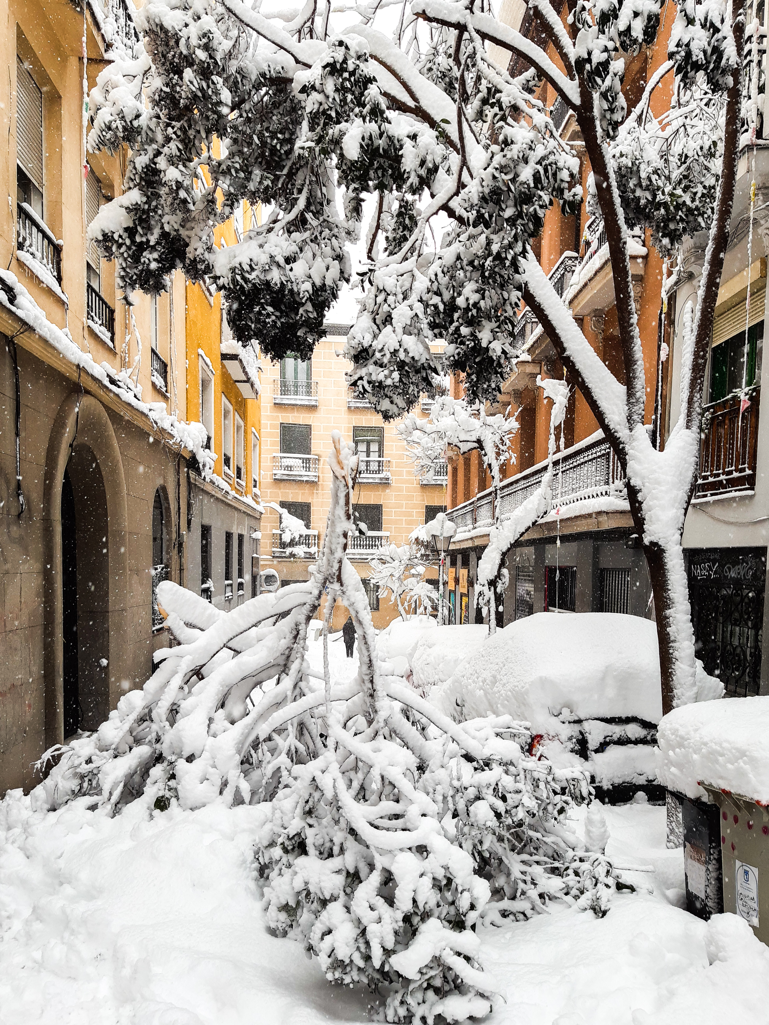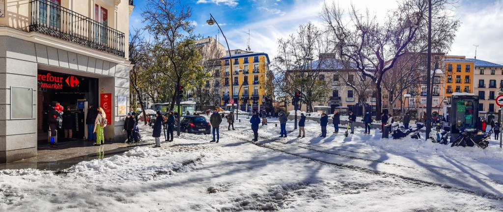For the people who are here to read about the snow. We’ve had the most spectacular snowfall caused by the storm Filomena (described by Wikipedia as “fairly weak”) on the night of January 8th. Almost a metre of snow fell overnight, paralysing the capital for many days afterwards. The following Saturday was winter wonderland, everything was immaculate, cars trapped (sometimes abandoned in the middle of the road as the Spaniards discovered that summer tyres really don’t work in deep snow), people snowboarding in parks and skiing on Granvia. Then the fun began: 20 % of the trees in the capital collapsed (70% damaged in the historical parks), no rubbish collection for days in some narrow streets in the city centre, loads of wet snow slipping off the roofs, posing danger to people and cars, blood shortage in the hospitals due to over 3000 people being admitted to A&E after having slipped and broken something. The funniest feature of the Filomena aftermath were the infinite queues in front of the shops (see the photo above) – and nothing in there to buy as the delivery vans could not arrive. It looked like my country in the 80s. Real socialism. I get it. It was unprecedented. But you knew it was going to snow, the least you could have done was removing the Christmas decorations, so that they would not fall and block the streets for 5 more days. On the other hand, Filomena achieved what Madame Ayuso never managed to (not that this stopped her from taking all the credit): with schools and most businesses closed for the following 10 days and people physically forced to stay at home, our Covid incidence plummeted rapidly. For a while at least.