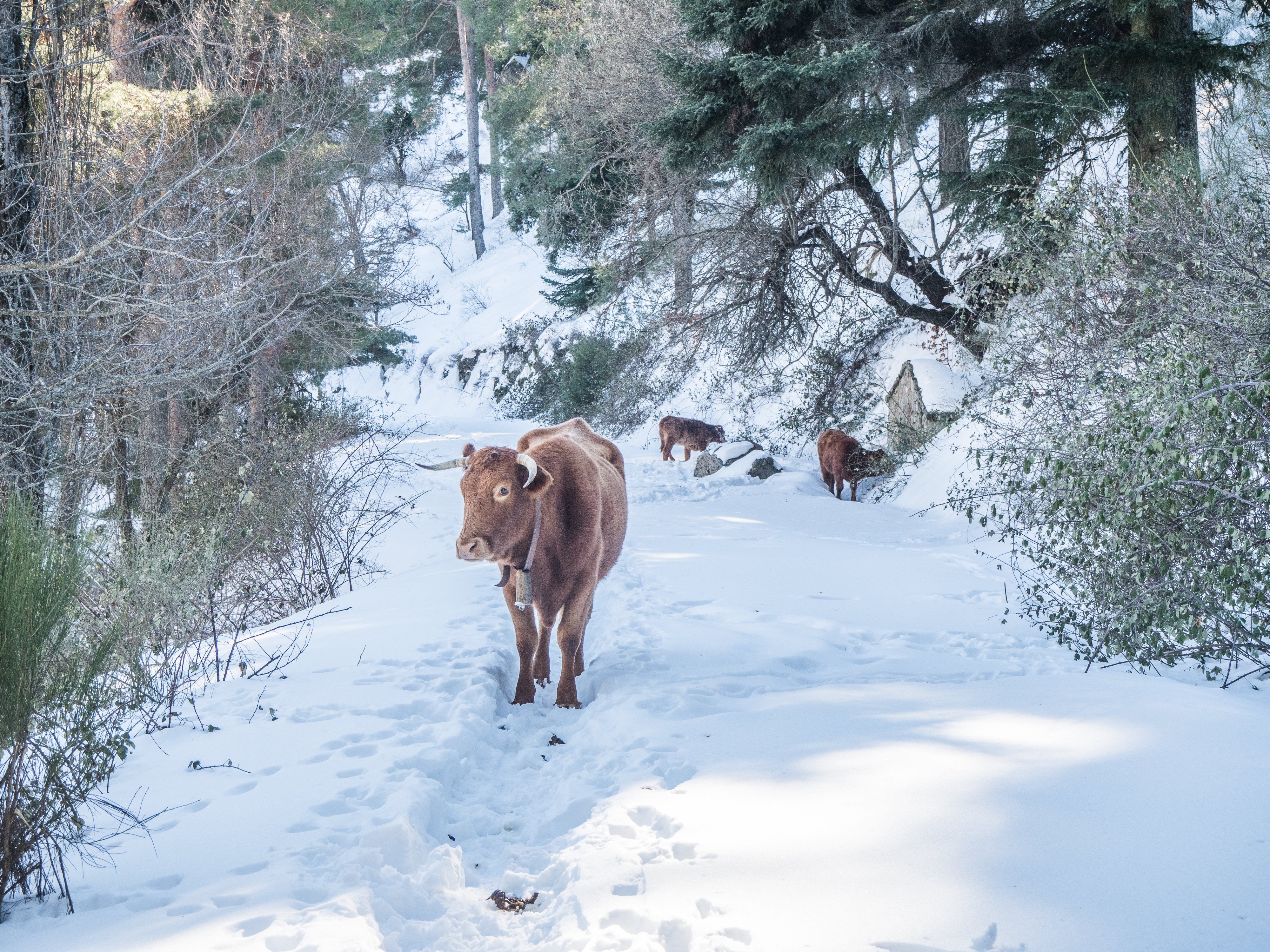 On another day we attempted to hike Alto de Abantos from San Lorenzo El Escorial, which went surprisingly well, until we encountered an overprotective cow with to two babies that wouldn’t let us pass. I know cows are normally harmless, but this one was charging and there was no way we could avoid her. We hiked in the snow on the old tarmac road that leads to Abantos roughly half way, then took a trail down. I will talk about the hike in the next post, as I managed to finish it subsequently. I hope you enjoyed the photos.