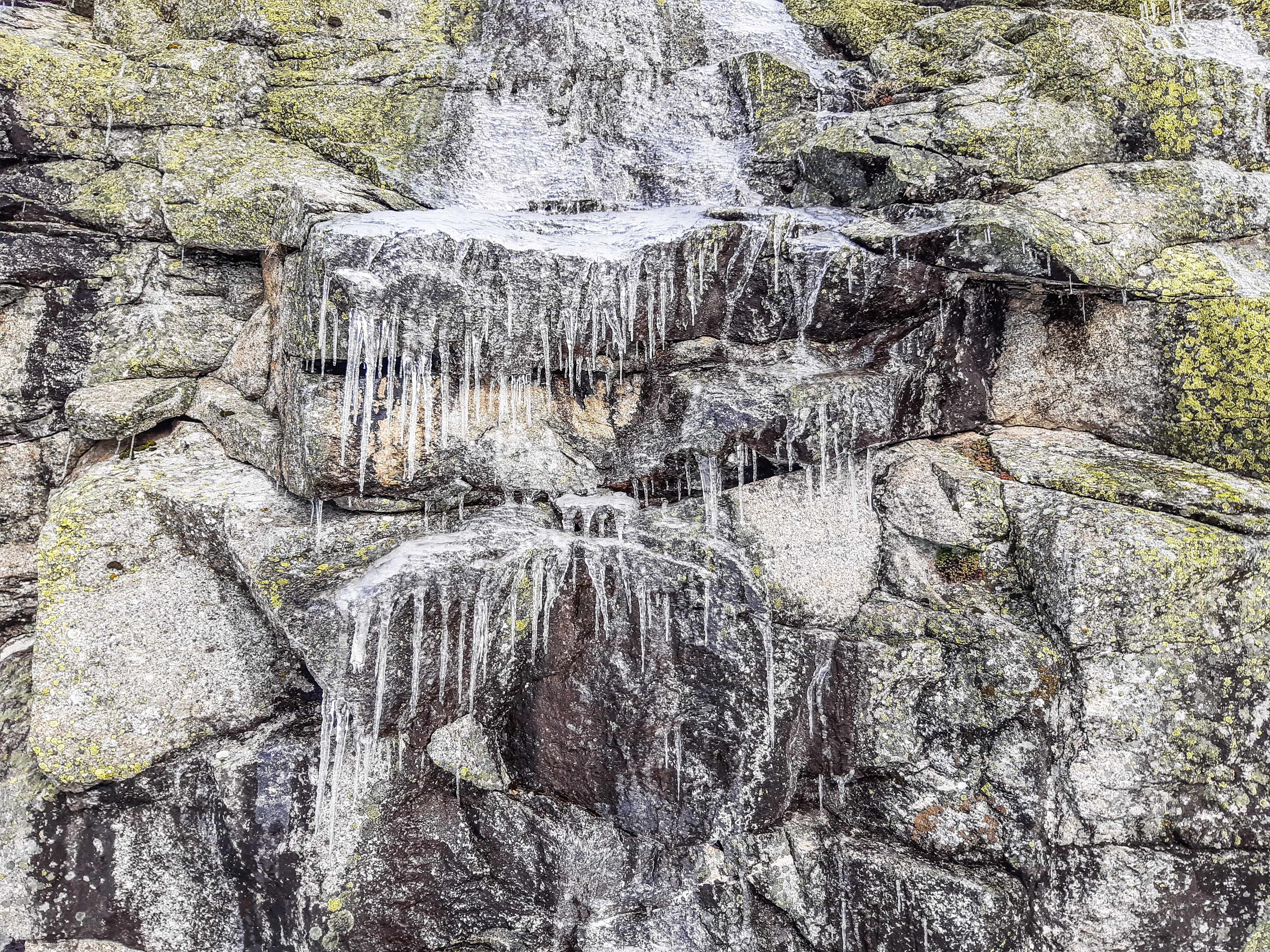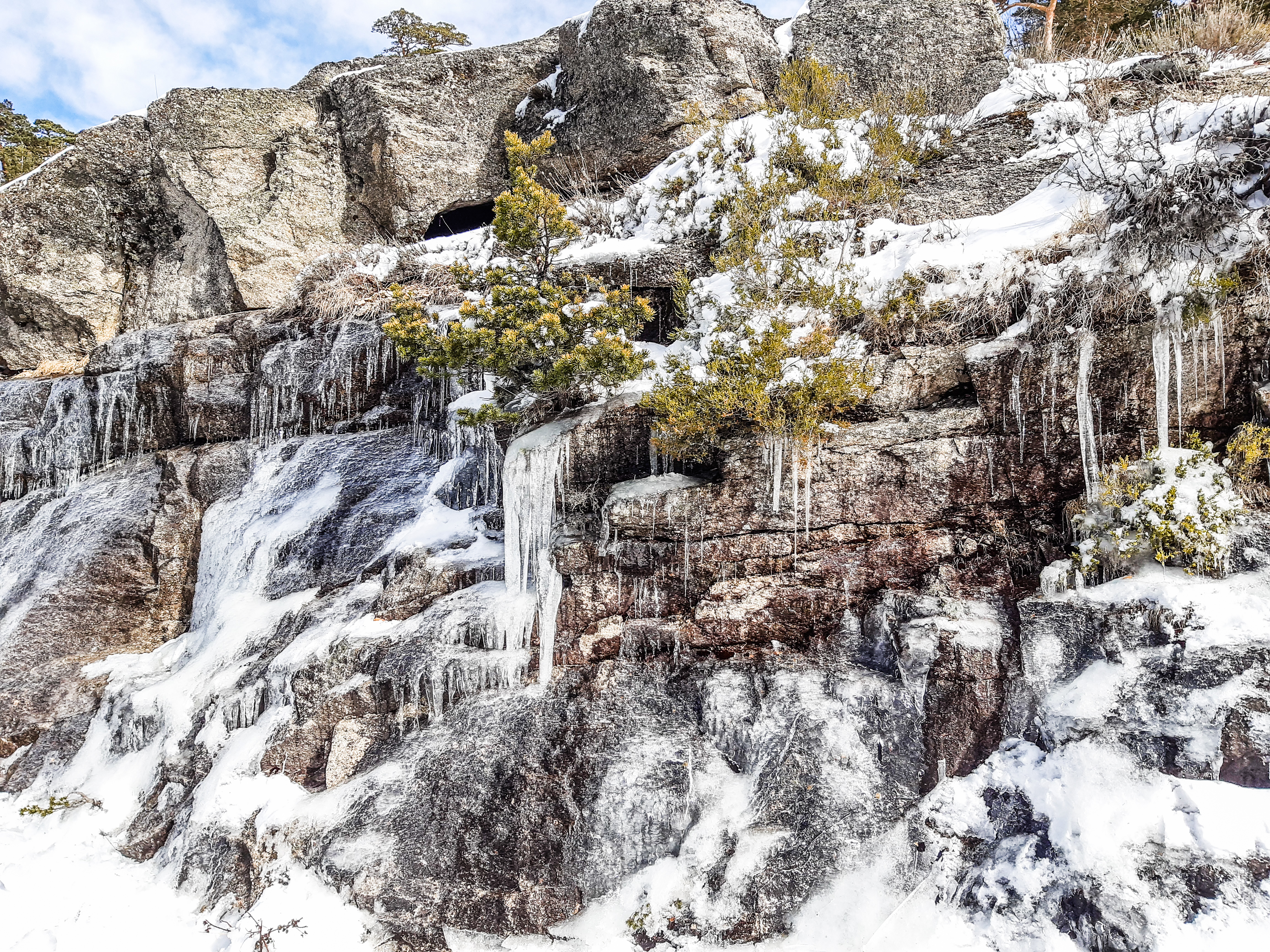 Description: as I said, it is a pretty straightforward walk. I didn’t want to do anything extreme, because I wasn’t sure what the weather was going to be like up there, and I had seen days when it was spring in Madrid and blizzard in the mountains, so I made sure there was a safe and easy way back, in case of necessity. Camino Puricelli starts right at the train station. You don’t even have to leave the building. Follow the railroad tracks for about 100 m, and you will find some stairs on your right hand side. Climb them and follow the trail (marked blue, later red when it joins Calle Alta) for about 4 km, until you reach the hospital La Fuenfría (a 100 years old former sanatorium for patients with tuberculosis and other pulmonary diseases, in the 1950s one of the most prestigious in Europe, now a public hospital – which itself is a rare sight around here). Follow the paved road and turn left on the crossing, then keep right. I know I sound like a tom tom, but this shortcut will avoid you 2 km extra on tarmac. The paved road ends at the Majavilán parking, where you can chose between several trails to climb up to the mountains. My plan was Calzada Borbónica (marked white), which is part of Camino de Santiago, so you can follow the St. James’s shell signs, too. The trail ascends along the stream Arroyo de la Fuenfría up to the pass Puerto de la Fuenfría (1.794 m), the highest point of the hike. From here turn right on the Carretera de la República, a wide flat dirt road usually used by MTB cyclists and follow it for 4 km to Mirador de los Poetas. The road then gently descends all the way back to Las Dehesas (this was the intended escape option had the weather been foul), but as the ice on the trails was manageable with caution, I took a steeper shortcut on the Senda de los Miradores (marked yellow). After about 45 minutes of descend, this path crosses with Camino del Agua (marked light blue), which will take you back to Cercedilla village.